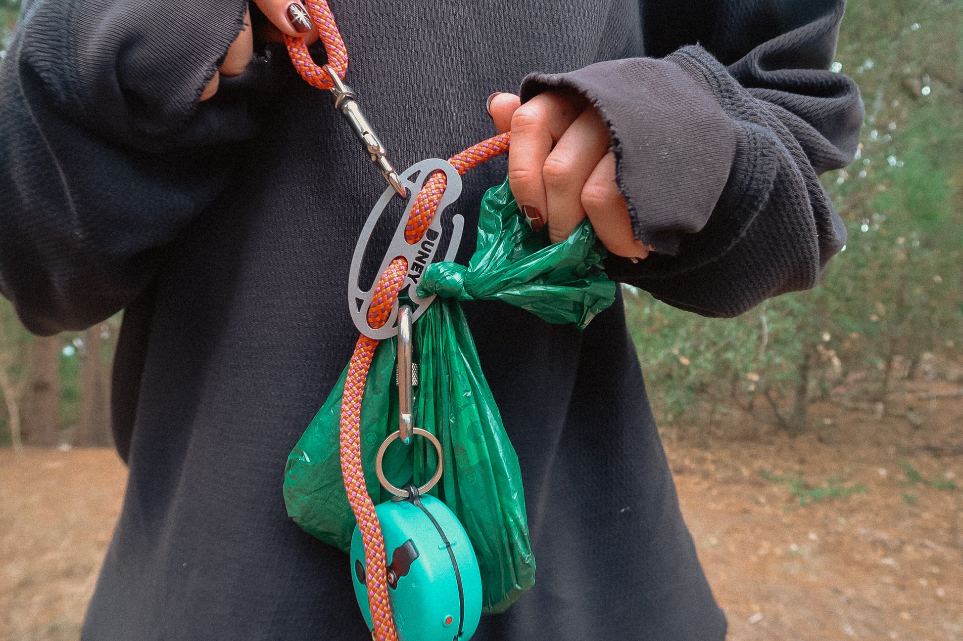 The DUNEY TrailClip Slip is a hands-free slip lead made from 7mm nylon accessory cord with stainless steel crimps and hardware. Featuring our TrailClip anchor, it adds a secure attachment point for essentials while you’re out on the trail. The TrailClip has a dedicated slot to carry up to 4 used poop bags, plus room for attachments like e-collar remotes, keys, tug balls, etc. Built for durability, comfort, and versatility, it’s designed for both everyday use and rugged adventures.